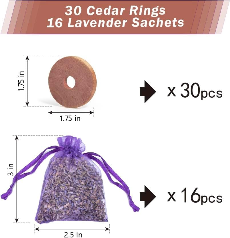 - Included: 30 small red cedar rings, and 16 lavender flower sachets. Shake the bag or squeeze the sachets a little before use for a strong lavender fragrance.